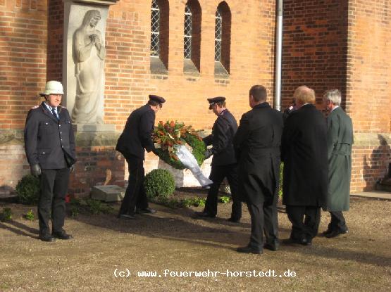 Mit einer Abordnung beteiligte sich auch in diesem Jahr wieder die FF Horstedt an den Gedenkfeiern anlässlich des Volkstrauertages. Nach dem gemeinsamen Gottesdienst in der Kirche zu Thedinghausen legten die Verantwortlichen der Feuerwehren Horstedt, Dibbersen-Donnerstedt und Thedinghausen bei eisigem Wind Kränze an den Ehrenmalen nieder. Fotos: